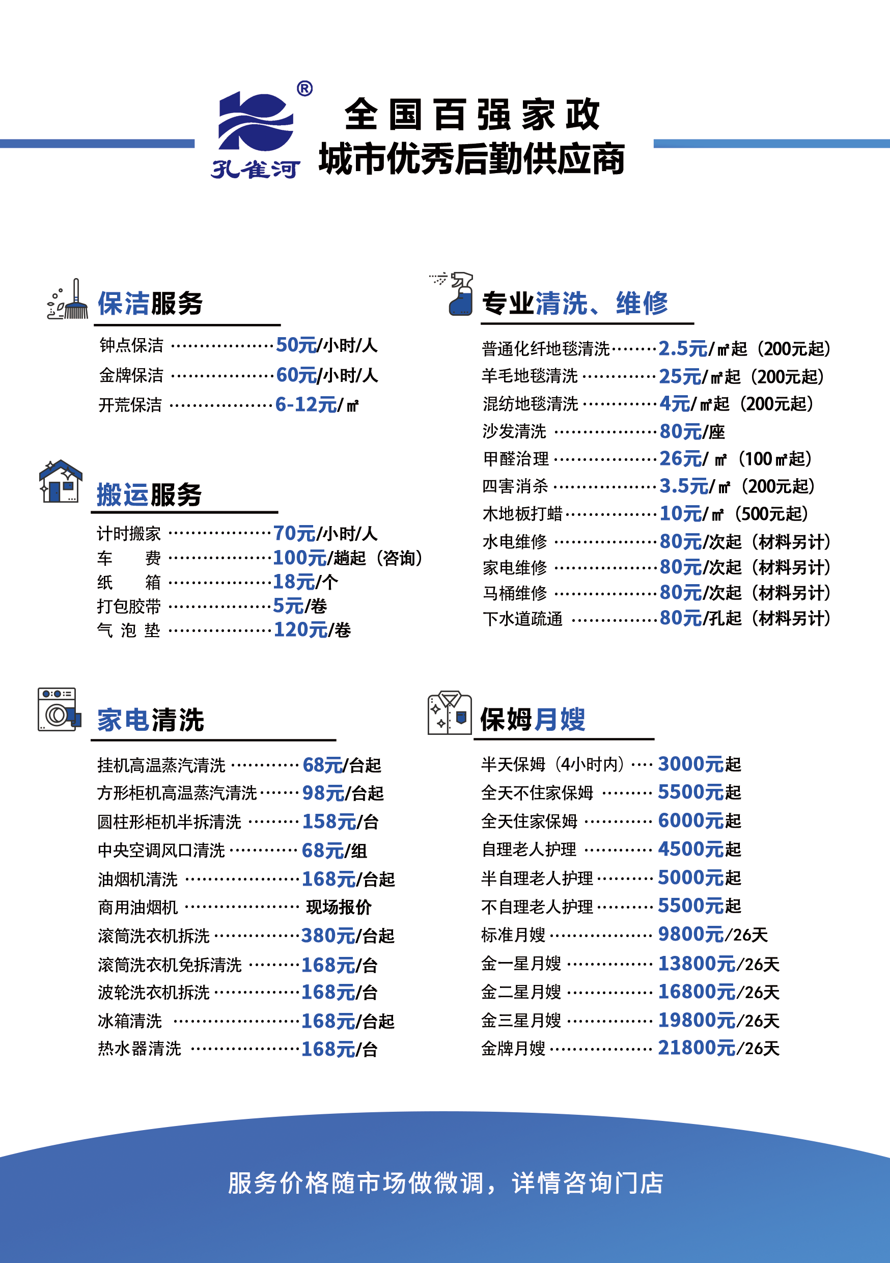 孔雀河家政服務(wù)參考價(jià)格表